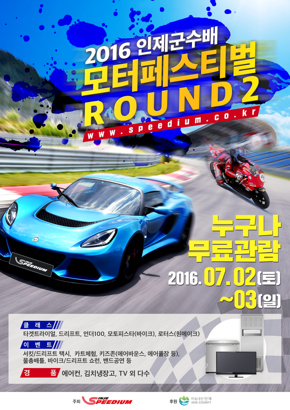 이와 함께 7월2일부터 3일까지 이틀간 인제스피디움에서는 인제군수배 모터페스티벌 2라운드 대회가 열린다. 이번 대회는 연간 총 4라운드로 개최되는 인제군수배 모터페스티벌 대회 중 2라운드 경기로 제3회 인제 바퀴축제 기간에 열려 관광객들에게 다양한 볼거리를 제공할 전망이다.