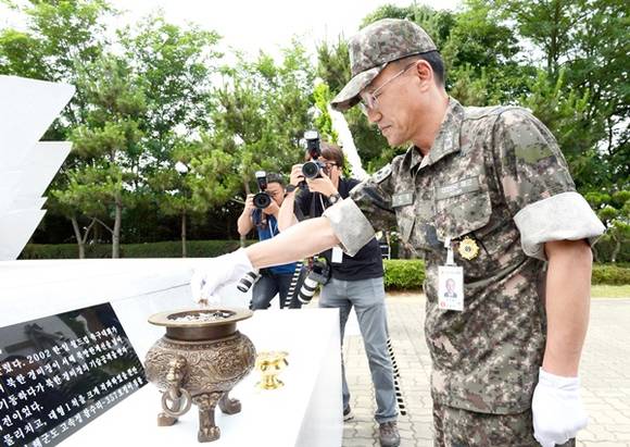 ▲부석종 2함대 사령관(소장)이 제2연평해전 6용사에 대해 분향하고 있다.(사진=해군2함대)