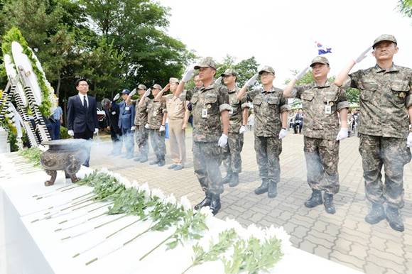 ▲박동선 해상전투단장(준장)을 비롯한 해군 2함대 지휘관들이 제2연평해전 6용사에 대해 경례하고 있다.