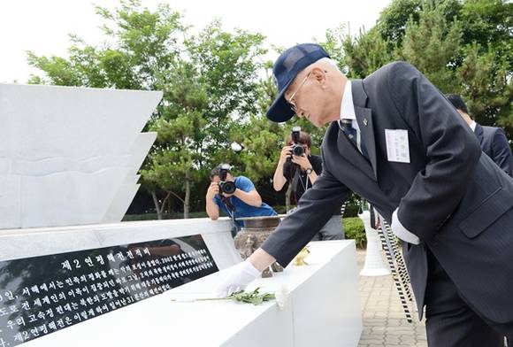 ▲윤두호(우, 故 윤영하 소령 아버지)가 제2연평해전 6용사에 대해 헌화하고 있다.(사진=해군2함대)