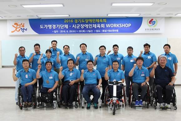 경기도장애인체육회는 지난 29일부터 30일까지 화성시 소재 모 연수원에서 시군장애인체육회 및 가맹경기단체 임직원 100여 명이 참가한 가운데 경기도 장애인체육 중장기 발전방향을 논의하기 위한 2016년 상반기 경기도장애인체육회 단체 워크숍 워크숍을 개최했다.