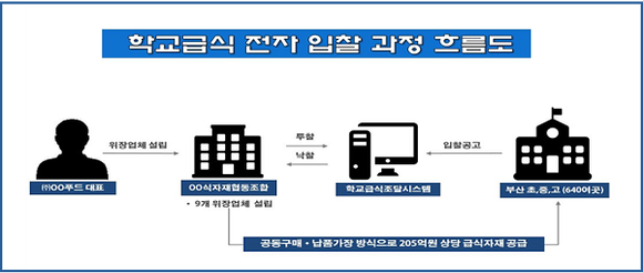 부산지방경찰청 지능범죄수사대는 허위의 협동조합을 설립해 학교급식전자조달시스템(EAT시스템)에 담합·응찰하는 수법으로, 부산지역 초·중·고교 640여 곳에 205억 원 상당의 식자재 납품계약을 체결한 업체 대표 등 총 11명을 입찰방해 등 혐의로 입건하고 이중 업체 대표 김모(49) 씨와 조합장 한모(59) 씨를 구속했다고 4일 밝혔다.