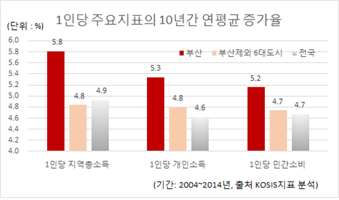 부산시는 통계청 자료를 대상으로 지난 10년(`04년~`14년)간의 소득과 소비 증가율을 분석한 결과 부산의 1인당 개인소득은 2004년 당시만 해도 984만6천원으로 대전, 충남보다도 낮은 수준이었으나 연평균 5.3%의 높은 증가를 이루어 현재에 이르렀으며 이는 16개 시도 중 가장 높은 증가율이다.