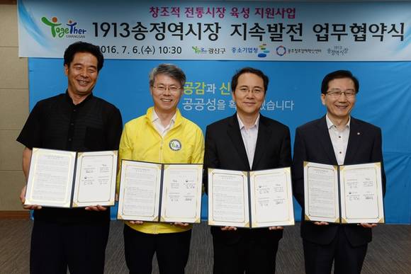 6일 오전 광산구청 상황실에서 가진 협약식에는 민형배 광산구청장, 김인섭 1913송정역시장 상인회장, 유기호 광주창조경제혁신센터장, 김영환 광주전남지방중소기업청장이 참석해 협약서에 서명했다.
