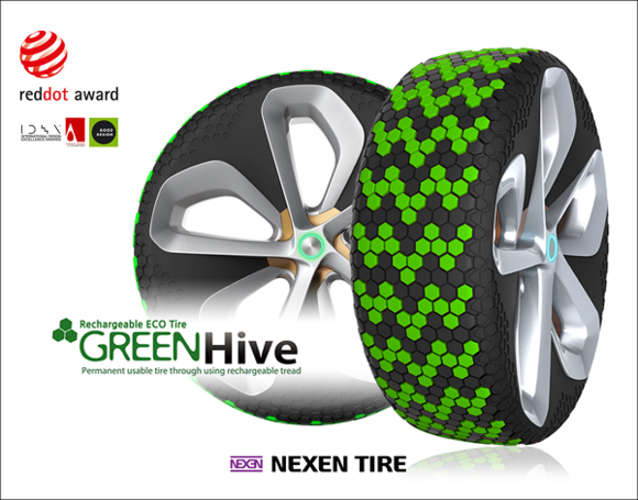 트레드 재충전식의 친환경 컨셉타이어 '그린하이브'는 미국 IDEA 디자인 어워드를 시작으로 지난해 이탈리아 A 디자인 어워드, 올해 미국 그린 굿 디자인 어워드에 이어 독일 레드닷 어워드까지 수상하며 글로벌 디자인 어워드에서 연이은 호평을 받고 있다.