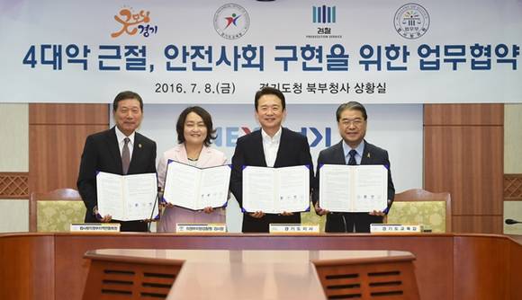 남경필 경기도지사와 이재정 경기도교육감, 조희진 의정부지방검찰청 검사장, 김한주 법사랑 의정부지역연합회장은 8일 오전 경기도청 북부청사 상황실에서 이같은 내용을 담은 4대악 근절 업무협약을 체결했다.