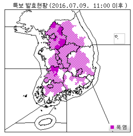앞서 8일 폭염주의보는 서울, 대전, 경기도, 강원, 충청, 충북 등 전국 대부분 지역에 내려졌고 이날 오전에는 경기도(시흥·안산 등)와 전북(군산·고창 등), 경남(김해·하동) 등으로 확대됐다.