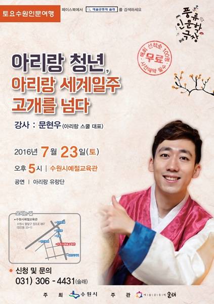 아리랑청년, 아리랑 세계일주 고개를 넘다라는 주제로 펼쳐지는 이번 강연은 2016 토요수원인문여행- 풍류인문학극장의 네 번째 강연으로 취업난 등 어려운 시기를 보내는 청년들에게 꿈과 희망의 메시지를 전달할 예정이다. 아울러 걸어다니는 한국을 주제로 한 아리랑 유랑단의 전통공연도 진행돼 강연의 분위기를 한층 돋울 것으로 보인다.