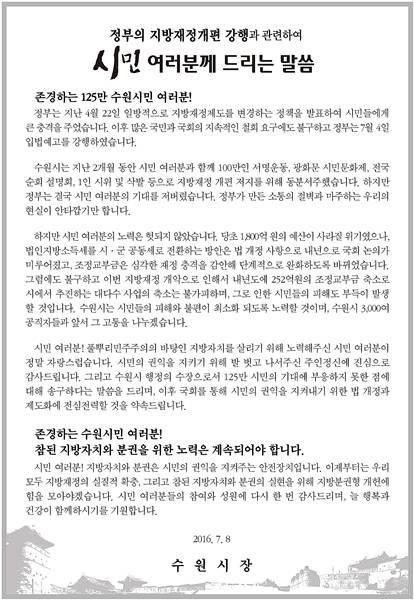 염태영 수원시장이 11일 정부의 지방재정개편 강행과 관련하여 시민 여러분께 드리는 말씀이라는 호소문을 발표했다.
