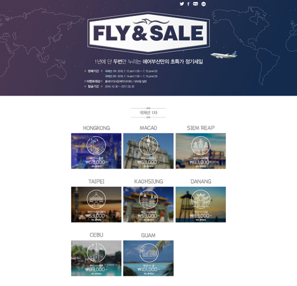 FLY&SALE 프로모션은 노선별로 판매 시작 시간이 상이하다. 12일 오전 11시부터 홍콩·마카오·대만·동남아·괌 노선 판매가 시작되며, 14일 오전 11시부터 일본·중국 노선 판매를 시작된다. 이벤트 종료 시간은 15일 오후 4시로 동일하며 특가 항공권의 탑승기간은 10월 30일부터 2017년 3월 25일까지다.