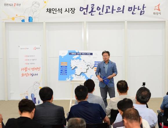 채인석 화성시장이 13일 화성시 전곡항 마리나 클럽 하우스에서 민선 6기 2주년을 맞아 기자간담회를 가졌다.