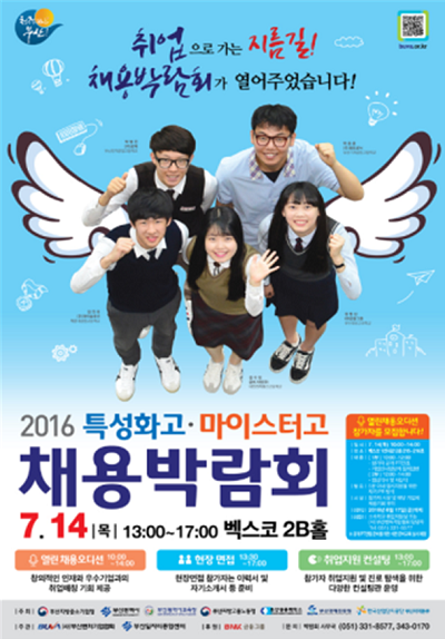 부산시와 부산시교육청은 7월 14일 오후 1시부터 5시까지 부산 해운대구 벡스코 제1전시장에서 특성화고 및 마이스터고 37개교 학생 2천여명을 대상으로 취업정보와 강소기업 채용 기회를 제공하기 위해 '특성화고·마이스터고 채용박람회'를 개최한다.