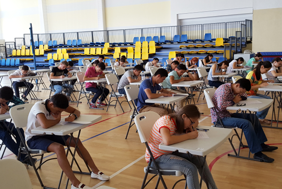 ▲부산대 특별전형에 응시한 카자흐스탄 학생들이 필답고사를 치르고 있다. (사진제공=부산대)