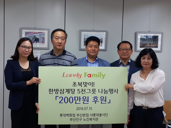 롯데백화점 부산본점(점장 송정호) 샤롯데 봉사단은 15일 부산진구노인복지관에서 '부산진구 주관 초복맞이 삼계탕 5천 그릇 나눔 행사' 참여 일환으로 지역 어르신들을 초청해 200만원 상당의 삼계탕을 직접 제공했다. (사진제공=롯데백화점)