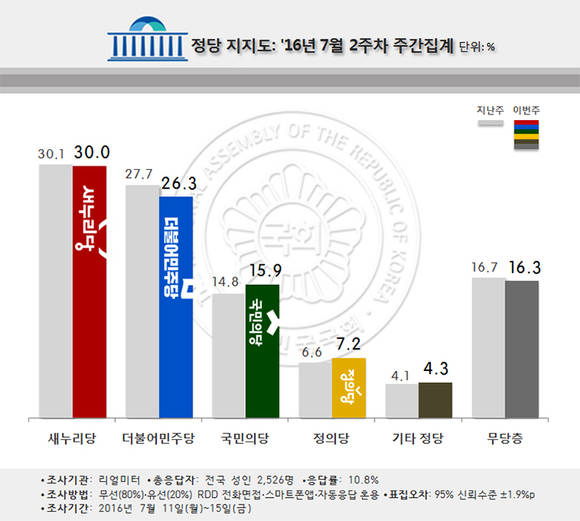 새누리당 지지율 역시 주간 평균으로는 0.1%p 하락한 30.0%를 기록했으나, 일간 집계로도 11(31.3%) 이후 15(29.2%)까지 4일 연속 하락하며 20%대로 주저앉는 등 동반하락 했다.