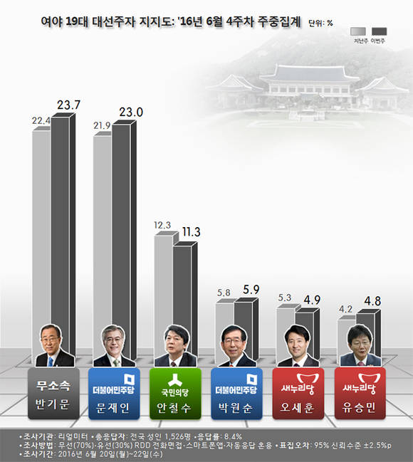차기 대선주자 지지도는 반기문 유엔사무총장이 1.5%p 내린 21.5%, 2주 연속 하락했으나 7주 연속 선두 자리를 지켰으며, 더민주 문재인 전 대표는 18.9%0.6%p 하락한 반면, 국민의당 안철수 전 대표는 0.5%p 오른 12.1%를 기록했다.