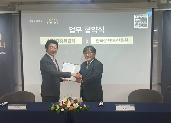 ▲왼쪽부터 영진위 김세훈 위원장, 송성각 한국콘텐츠진흥원장. (사진제공=영진위)