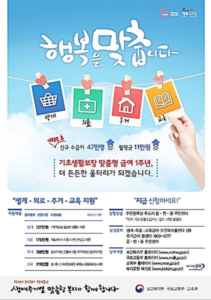 맞춤형급여는 그동안 최저생계비 이하 가구에게 통합된 급여를 지급하던 기존 방식에서 상대적 빈곤개념인 중위소득을 도입하고 급여별로 선정기준을 세분화한 제도로 이에 소득이 기준선을 넘으면 모든 급여를 받지 못하는 기존 방식과 달리 4개 분야(생계, 의료, 주거, 교육) 기준을 각각 마련, 분야별로 급여를 지급받을 수 있게 된다.