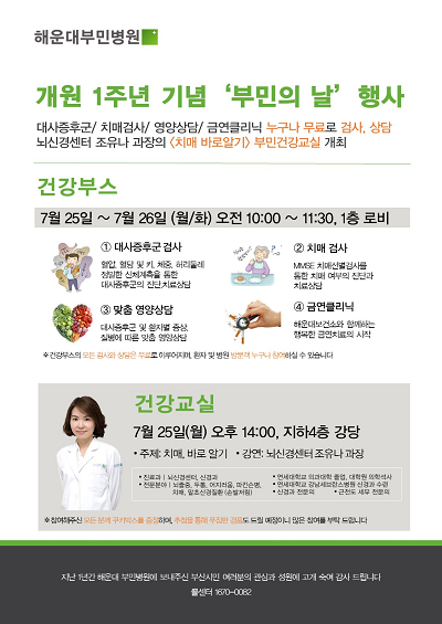 개원을 기념해 7월 마지막째 주, 다양한 건강 프로그램을 마련하고 원내에서 다채로운 행사를 진행할 예정이다. 7월 25일부터 26일까지 양일간 병원 1층 로비에서 해운대구보건소와 함께 '건강부스'를 설치하고 지역민과 병원을 찾는 이용객들에게 무료로 건강 상태를 체크할 수 있도록 한다.