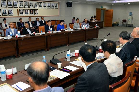 ▲윤장현 광주광역시장은 21일 오전 시청 3층 중회의실에서 열린 제2차 광주원로회의에 참석해 민선6기 2년 성찰 및 향후 방향에 대해 설명하고 원로들로부터 의견을 수렴하고 있다.(사진=광주시)