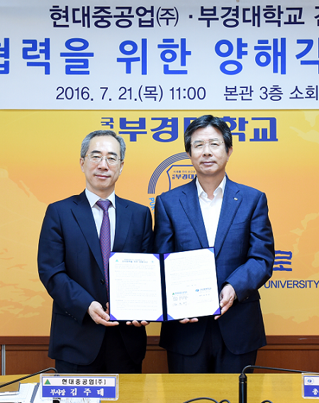 부경대 김영섭 총장과 현대중공업 엔진기계사업본부 김주태 사업대표는 21일 오전 11시 부산 남구 부경대 대학본부 3층 회의실에서 원양어선 등 중소형 추진용 선박 선진화를 위한 기술 및 제품 개발, 우수 엔지니어 양성 등을 위한 상호 협력 및 교류 양해각서를 체결했다.