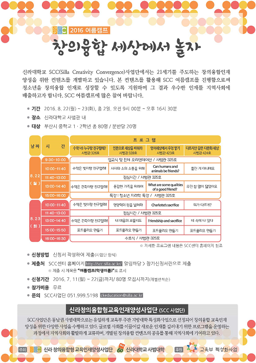 신라대학교 창의융합형 교육인재양성사업단(Silla Creativity Convergence Education Institute, 이하 SCC사업단)은 여름방학을 맞아 '창의융합 세상에서 놀자' 여름캠프를 8월 22일부터 23일까지 신라대 사범관에서 중학생 1, 2학년을 대상으로 개최한다고 밝혔다.