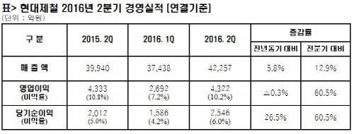 현대제철은 올해 2분기 연결기준 매출과 영업이익이 각각 4조2257억원, 4322억원을 기록했다고 22일 공시했다.