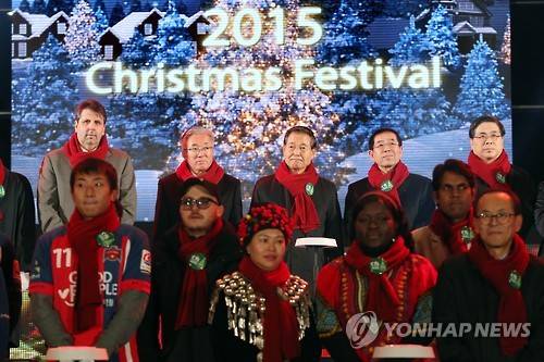 ▲지난해 11월 28일 '2015 대한민국 성탄축제 트리 점등식'에 참석한 감경철 CTS기독교TV 회장(뒷줄 가운데). (사진=연합뉴스)
