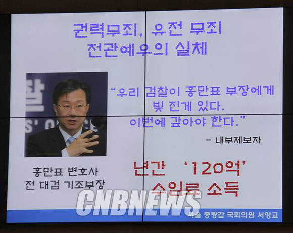이는 검찰 고위간부 출신인 홍만표 변호사를 지칭한 것이다. <일요신문>이 최근 입수한 ‘2011년~12년 홍만표법률사무소 매출(수입수수료) 현황 문건’에 따르면, 홍 변호사는 2012년 CTS으로부터 3억원, 안동개발(주)로부터 6000만원, (주)옥산레저로부터 7000만원, (주)조은닷컴으로부터 3000만원 등 총 4억 6000만원의 수임료를 받았다.