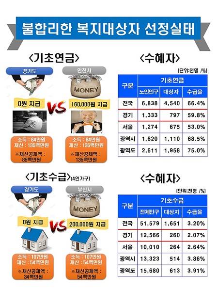 경기도가 조사한 바에 따르면 경기도내 기초연금 대상자는 노인인구 133만 3000명 가운데 59.8%인 79만 7000명으로 전국 광역시 평균 68.5%, 광역도 평균 75%, 전국 평균 66.4%보다도 낮다. 국민기초 수급자는 도 전체 인구 1256만 6000명 가운데 2.07%인 26만 명으로 이 역시 전국 평균 3.20%, 광역시 평균 3.86%, 광역도 평균 3.91% 보다도 훨씬 낮다. 복지부의 불합리한 기준으로 경기도민이 복지혜택을 덜 받고 있는 것이다.