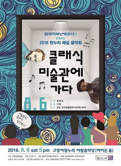 고양문화재단(대표 박진)은 8월 6일 토요일 오후 5시 고양아람누리 아람음악당에서 여름방학을 맞아 한국지역난방공사와 함께하는 2016 틴누리 해설 음악회인 '클래식, 미술관에 가다'를 공연한다고 밝혔다.