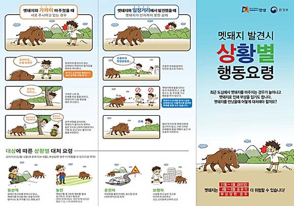 특히 멧돼지와 마주쳤을 때 등을 보이고 도망치거나 소리치면 멧돼지가 놀라 공격할 위험이 증가하므로 멧돼지 눈을 똑바로 처다보고 나무 등 은폐물 뒤로 몸을 숨기는 등 멧돼지 행동을 예의 주시한 후 멧돼지가 올라오지 못하는 높은 곳 등 안전한 곳으로 신속히 피해야 한다. 만약 주택가에 멧돼지 출현 시 119나 112 또는 안성시청 환경과로 신고할 것을 당부했다.