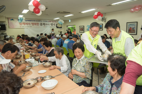 한국남부발전(사장 윤종근)이 27일 중복(中伏)을 맞아 '사랑의 삼계탕 DAY'를 마련, 지역내 1200여명의 어르신들께 삼계탕을 대접하며 따뜻한 정을 나눴다.