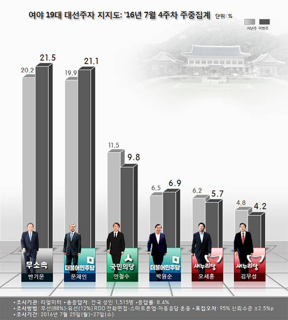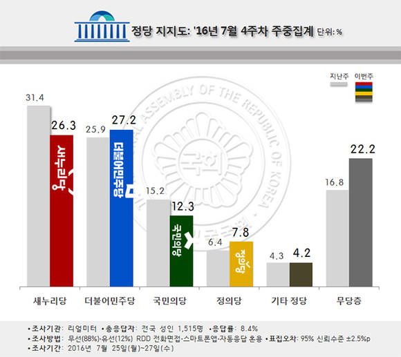 이번 주 중 집계는 2016725일부터 27일까지 3일간 전국 19세 이상 유권자 1515명을 대상으로 전화면접, 스마트폰앱, 자동응답 혼용 방식으로 조사했다. 응답률은 8.4%이고 표본오차는 95% 신뢰수준에서 ±2.5%포인트이다. 자세한 조사개요와 결과는 중앙선거여론조사공정심의위원회 홈페이지(http://www.nesdc.go.kr)를 참조하면 된다.