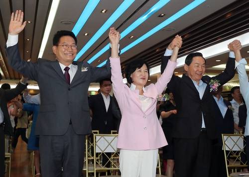 ▲당권 도전에 나선 더불어민주당 송영길(왼쪽부터)·추미애 의원·김상곤 전 혁신위원장이 26일 오후 서울 반포구 엘리체컨벤션에서 열린 서초갑 지역 대의원대회에서 손을 맞잡고 기념촬영을 하고 있다.(사진=연합뉴스)
