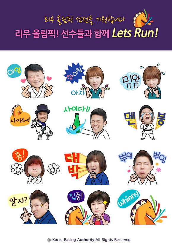렛츠런파크(한국마사회)스포츠단이 2016년 리우올림픽에 출전하는 소속 선수들의 선전을 기원하고자 리우 올림픽! 선수들과 함께 Lets Run! 이모티콘을 제작, 무료로 배포 중이다.