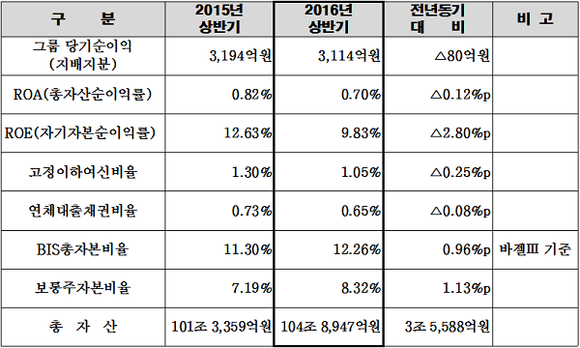 BNK금융그룹(회장 성세환)은 28일 이사회 개최 후 실적 발표를 통해 2016년 상반기(누적) 3114억원의 당기순이익(지배지분)을 시현했다고 밝혔다.