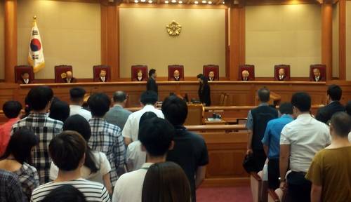 ▲28일 오후 서울 종로구 헌법재판소에서 '부정청탁 및 금품 등 수수의 금지에 관한 법률'(김영란법)에 대한 헌법소원 심판 사건 선고에 앞서 재판관들이 입장해 착석하고 있다.(사진=연합뉴스)