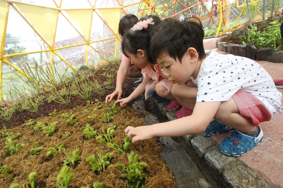 ▲식충식물인 '파리지옥'을 살펴보고 있는 어린이들.(사진제공=렛츠런파크 부경)