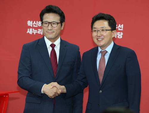 29일 서울 여의도 새누리당 당사에서 김용태 의원(사진 오른쪽)과 단일화한 정병국 의원(왼쪽)이 악수하고 있다. 정병국 의원은 김용태 의원과 벌인 여론조사에서 승리해 당대표 후보 단일화에 성공했다.