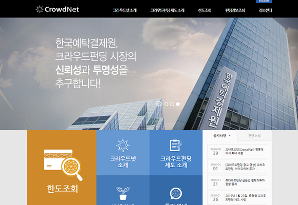 크라우드넷은 크라우드펀딩 제도 소개, 한도조회, 정보센터 등의 메뉴로 구성돼 있으며, 국문과 영문 페이지로 서비스를 제공하고 있다.