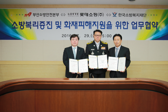 부산소방안전본부(본부장 김성곤)는 29일 오후 3시 본부 영상회의실에서 롯데쇼핑(대표이사 이원준), 한국소방복지재단부산지회와 업무협약을 체결했다.