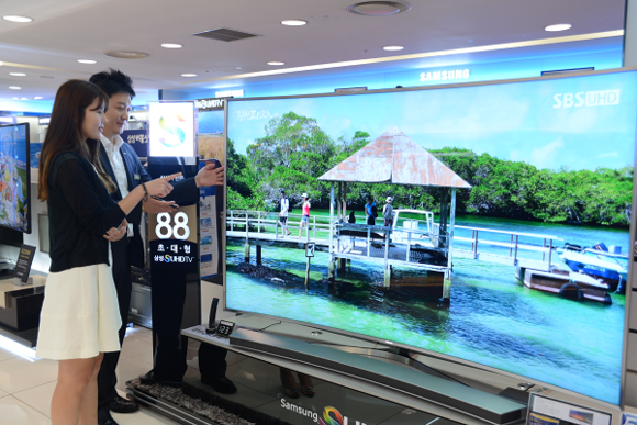 ▲리우 올림픽 개막을 앞두고 유통가 TV할인 행사가 잇다르고 있는 가운데 롯데백화점 부산본점 6층 가전 매장에서 고객이 초대형 TV를 살펴보고 있다. (사진제공=롯데백화점)