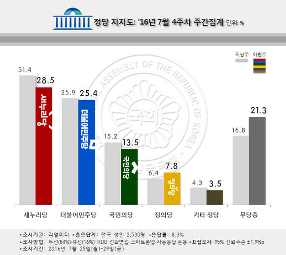 이번 주간집계는 2016년 7월 25일부터 29일까지 5일간 전국 19세 이상 유권자 2530명을 대상으로 전화면접, 스마트폰앱, 자동응답 혼용 방식으로 조사했다. 응답률은 8.3%이고 표본오차는 95% 신뢰수준에서 ±1.9%p이다. 해당 조사는 1일 오전 9시 30분에 최초 공표됐다. 자세한 조사개요와 결과는 중앙선거여론조사공정심의위원회 홈페이지(http://www.nesdc.go.kr)를 참조하면 된다.