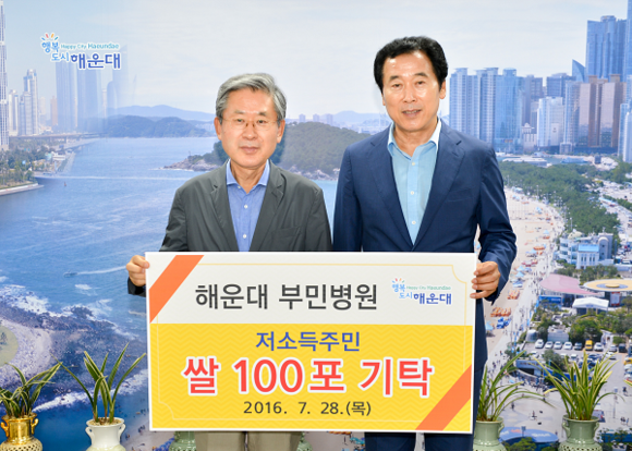 해운대부민병원(이사장 정흥태)은 개원 1주년을 맞아 관내 저소득 주민에게 전해 달라며 250만 원 상당의 쌀 10kg 들이 100포대를 부산 해운대구청(구청장 백선기)에 기탁했다. (사진제공=해운대구)