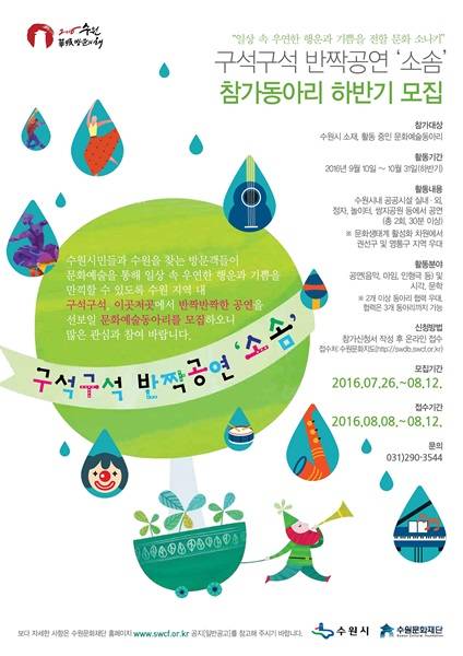 수원문화재단이 2016 수원화성 방문의 해를 맞아 수원시민들과 수원을 찾는 방문객들이 문화예술을 통해 일상 속 우연한 행운과 기쁨을 만끽할 수 있도록 구석구석 반짝공연 ‘소솜’을 오는 10월까지 운영한다.