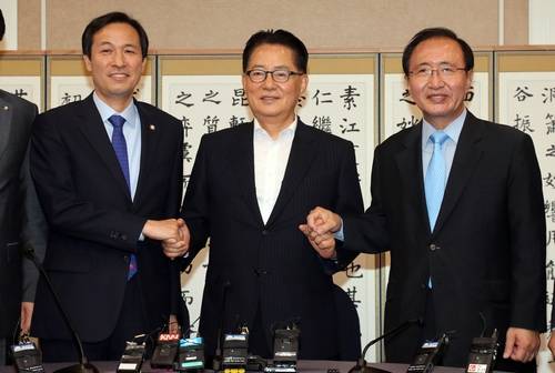 ▲더불어민주당 우상호 원내대표(왼쪽부터), 국민의당 박지원 비대위원장 겸 원내대표, 정의당 노회찬 원내대표 등 야 3당 원내대표가 3일 오전 국회 귀빈식당에서 고위공직자비리수사처(공수처) 신설을 비롯한 검찰개혁과 세월호 특별조사위 활동기간 연장 등에 대한 공조방안 논의에 앞서 손을 맞잡고 있다.(사진=연합뉴스)