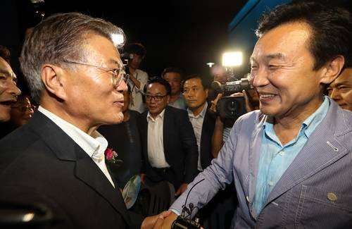 ▲더불어민주당 문재인 전 대표(왼쪽)와 손학규 전 상임고문이 6일 오후 전남 목포시 김대중노벨평화상기념관에서 열린 김대중 평화의밤 콘서트에서 만나 악수하고 있다.(목포=연합뉴스)