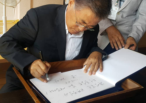 ▲더불어민주당 문재인 전 대표가 7일 전남 광양시 봉강면에 있는 구한 말 우국지사 매천 황현 선생 생가를 찾아 방명록에 글을 쓰고 있다.(광양=연합뉴스)