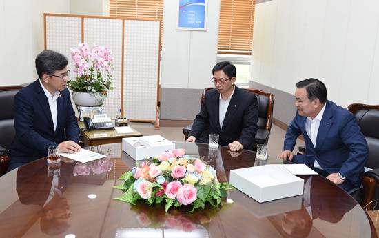 ▲(우측부터)이성호 양주시장이 정성호 국회의원과 송언석 기획재정부 제2차관을 방문해 지역현안에 대한 국비 예산 반영을 요청하고 있다(사진= 양주시)